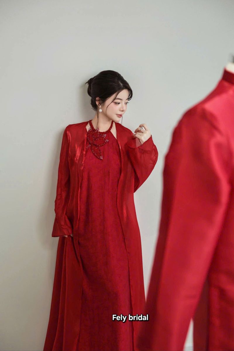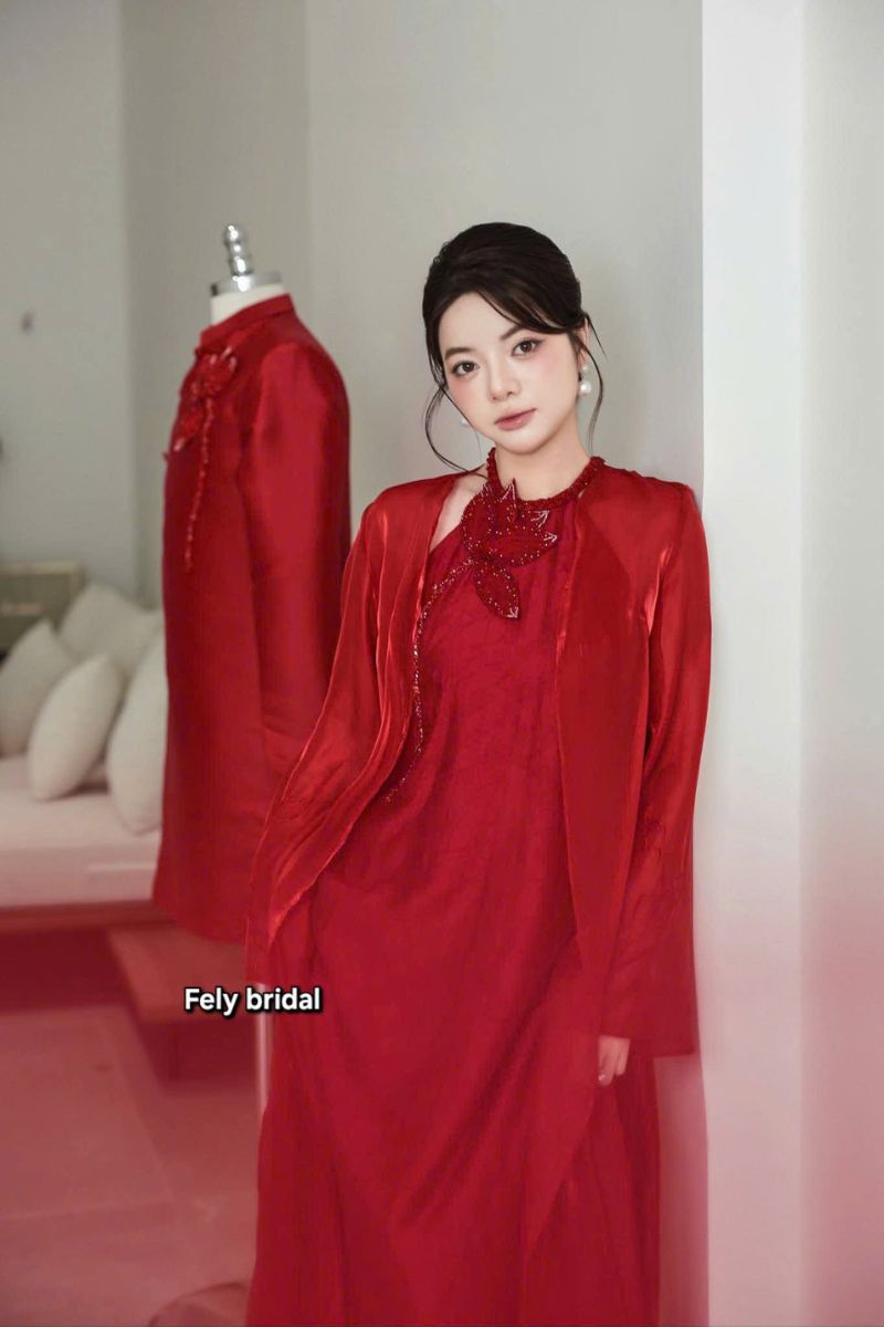 Xu hướng cưới hiện đại luôn tìm kiếm sự mới mẻ trong những giá trị xưa cũ. Cặp áo dài cưới cách tân đính hoa pha lê là minh chứng hoàn hảo cho điều đó. Bộ trang phục giữ lại nét son sắt của màu đỏ truyền thống. Tuy nhiên, kiểu dáng và chất liệu đã được thổi hồn đương đại. Đây là lựa chọn lý tưởng cho các cặp đôi yêu thích sự phá cách tinh tế.