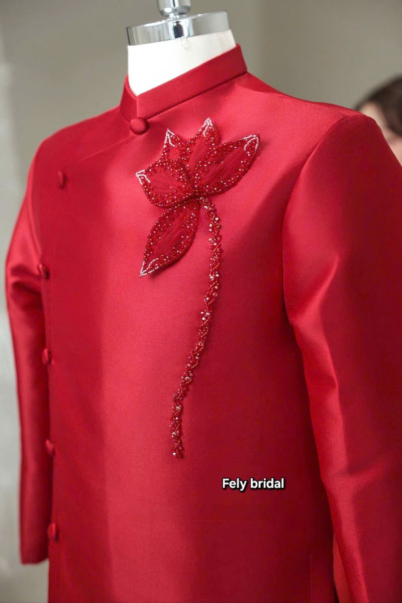 Các cánh hoa được tạo hình từ hàng trăm hạt pha lê và cườm đỏ. Chúng được đính kết tỉ mỉ bằng tay để đảm bảo độ bền chắc. Pha lê cùng tông màu đỏ với áo nhưng có độ lấp lánh vượt trội. Khi có ánh đèn chiếu vào, họa tiết sẽ tỏa sáng rực rỡ. Chi tiết này khẳng định giá trị cao cấp của bộ lễ phục.