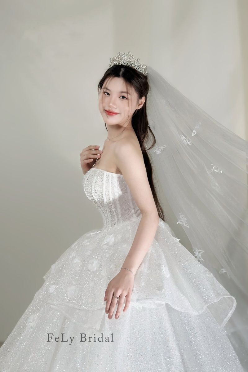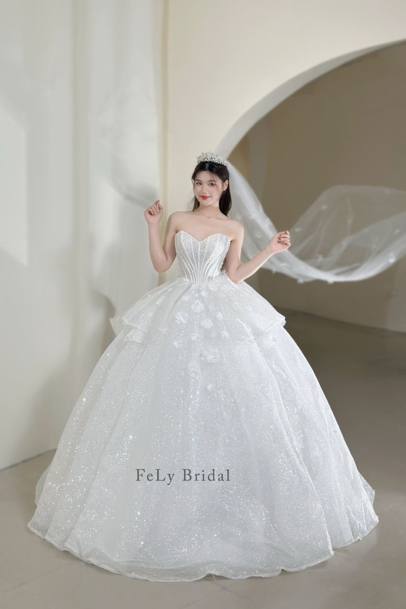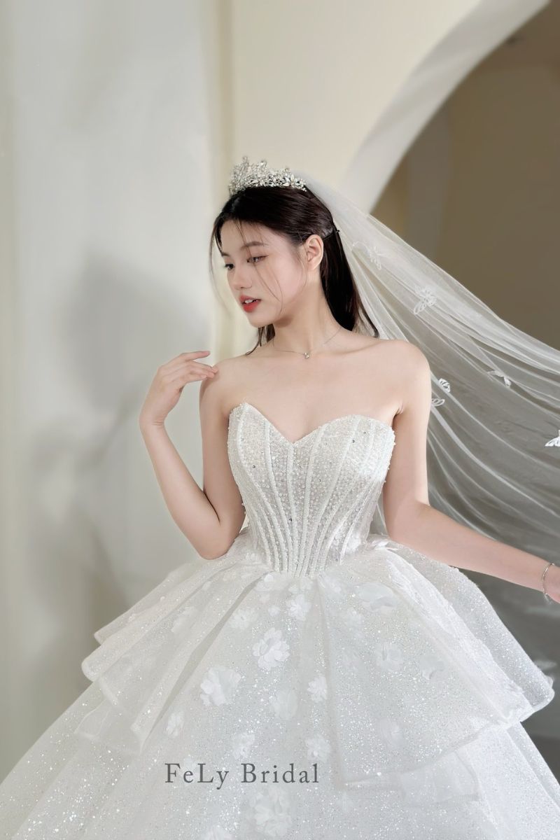 Một chiếc váy cưới không chỉ là trang phục, mà là cảm xúc. Đó là niềm hạnh phúc, là giây phút trái tim rung lên khi bạn nhìn thấy chính mình. Người con gái rạng rỡ, yêu thương và tràn đầy hy vọng. Hãy đến Fely Bridal để thử chiếc váy công chúa pha lê hoa nổi này nhé nàng dâu ơi!