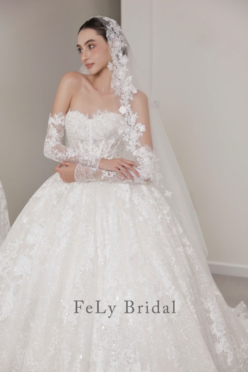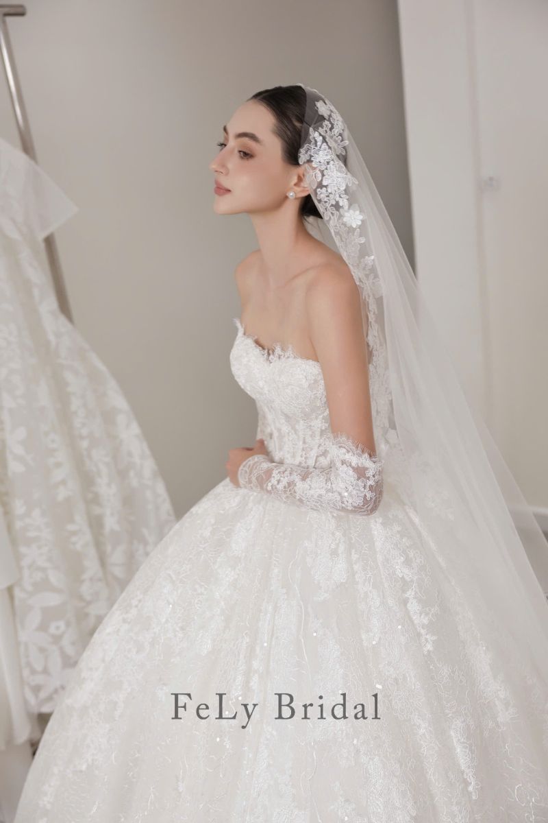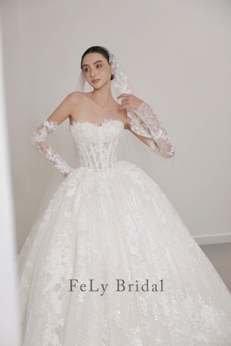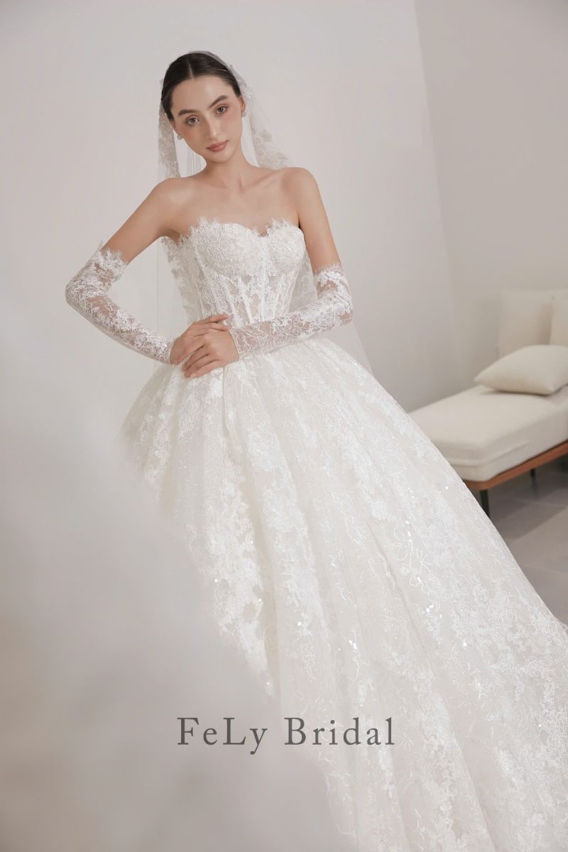 Khoảnh khắc lộng lẫy nhất cần một sự khởi đầu hoàn hảo. Váy cưới công chúa cúp ngực ren nổi kèm tay rời là tuyên ngôn của vẻ đẹp vượt thời gian. Sự kết hợp giữa thân áo định hình kiêu sa và tùng váy phủ ren hoa thêu nổi tạo nên một bức tranh thị giác lãng mạn. Thiết kế này tôn vinh sự quý phái, hứa hẹn một sự xuất hiện đầy mê hoặc, lưu giữ vĩnh viễn hình ảnh cô dâu kiều diễm nhất.