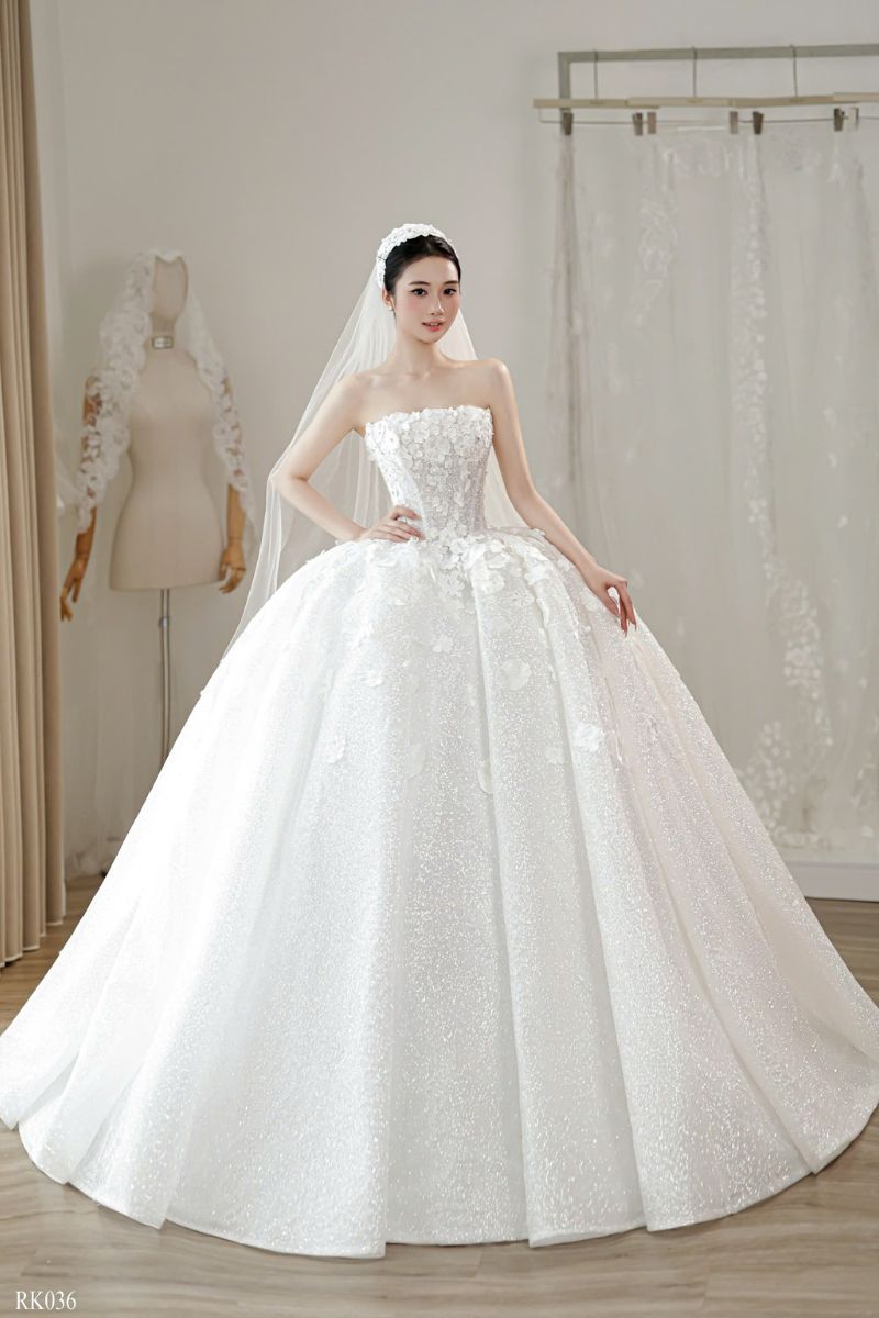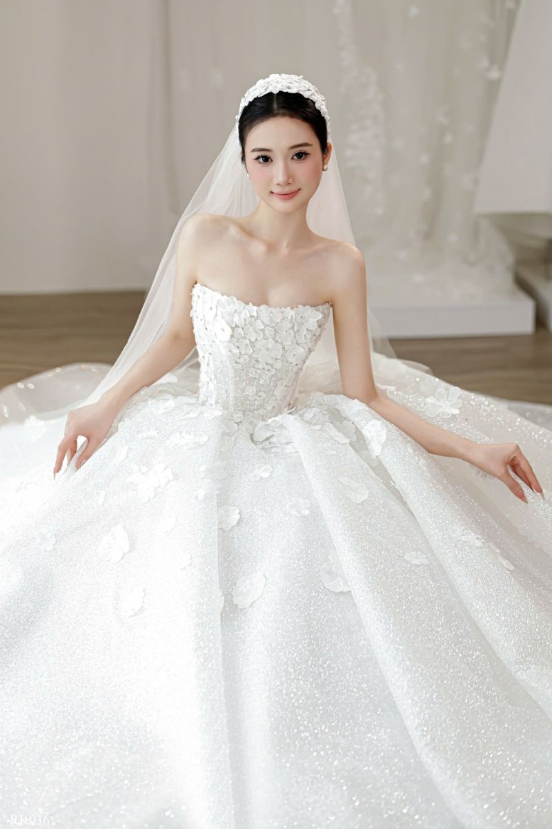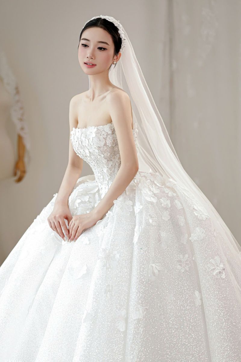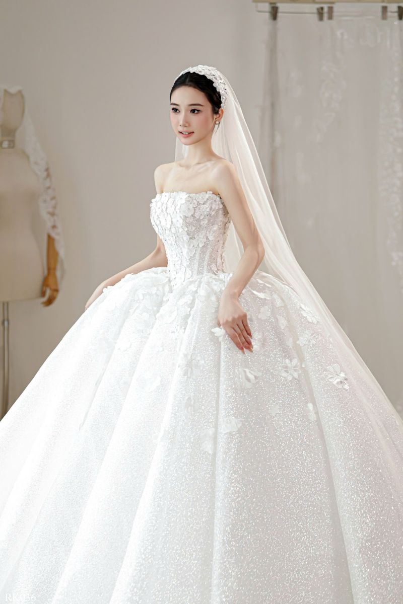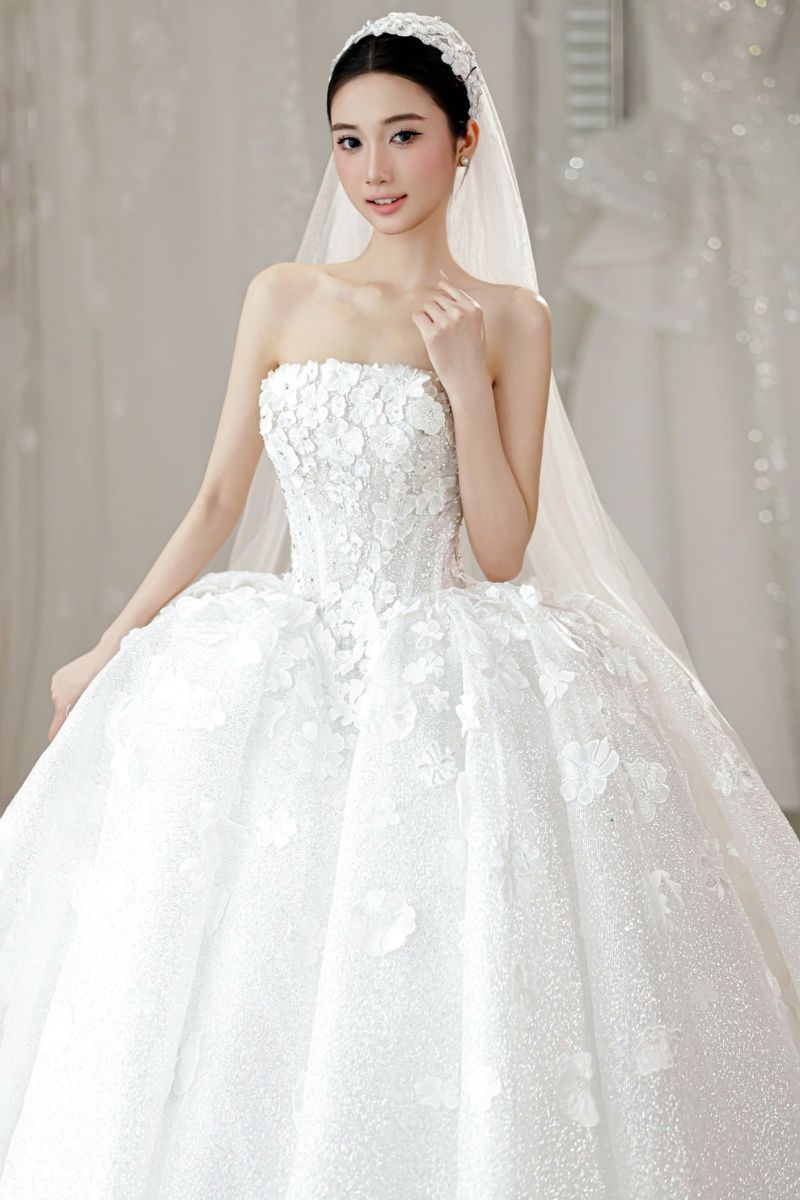 Chất liệu chính là lớp vải phủ nhũ mịn. Khi ánh sáng chiếu vào sẽ tạo hiệu ứng lấp lánh. Không quá chói nhưng đủ để thu hút ánh nhìn. Lớp ngoài kết hợp cùng hoa nổi tạo chiều sâu. Lớp trong mềm giúp váy giữ độ phồng tự nhiên. Khi di chuyển, váy có độ rủ nhẹ. Điều này giúp cô dâu luôn cảm thấy thoải mái. Một chất liệu vừa đẹp vừa dễ mặc.