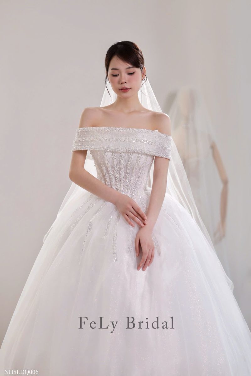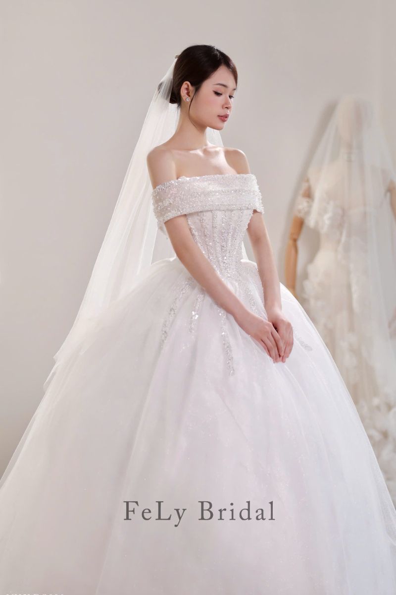 💍 Hãy đến showroom để thử ngay mẫu váy cưới công chúa trễ vai lấp lánh này và cảm nhận sự khác biệt.