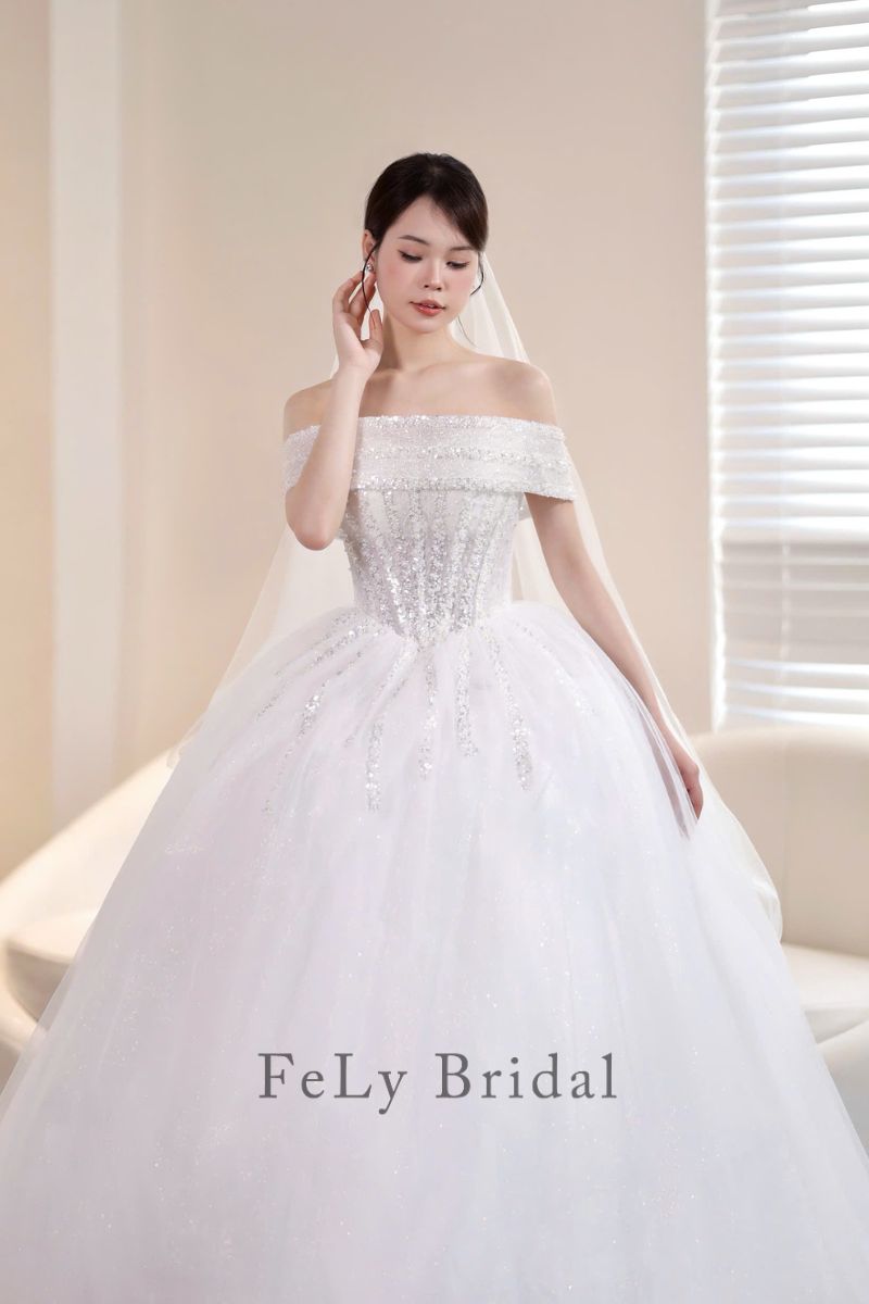 Váy Cưới Công Chúa Trễ Vai Lấp Lánh Phủ Kim Tuyến là mẫu váy dành cho những cô dâu mong muốn trở nên nổi bật và rực rỡ trong ngày cưới. Từ dáng bồng tinh tế đến lớp kim tuyến tỏa sáng, mọi chi tiết đều được hoàn thiện để tôn lên vẻ đẹp lãng mạn và nữ tính.