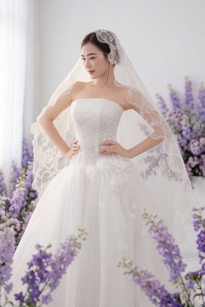 Bên trong là lớp lót mềm mại và thoáng khí. Cô dâu có thể mặc trong nhiều giờ mà vẫn dễ chịu. Đặc biệt phù hợp với thời tiết nóng ẩm. Đây là yếu tố quan trọng trong ngày cưới. Phần veil đi kèm được làm từ ren mỏng. Họa tiết ren tinh tế, không quá dày. Giúp tổng thể giữ được sự thanh thoát. Khi ánh sáng chiếu vào, veil trở nên lung linh hơn.
