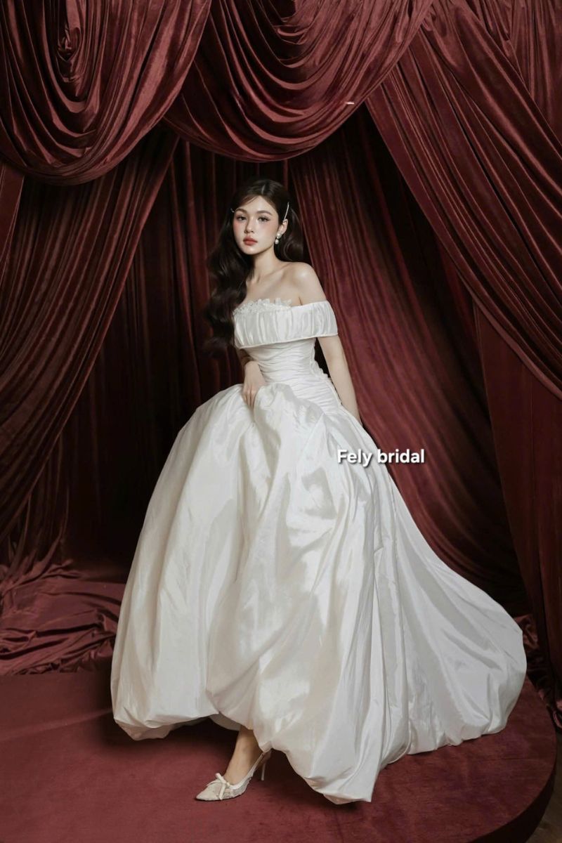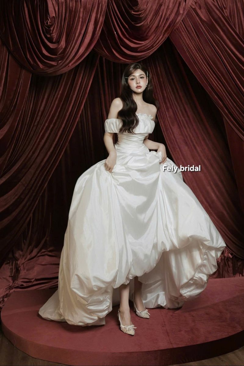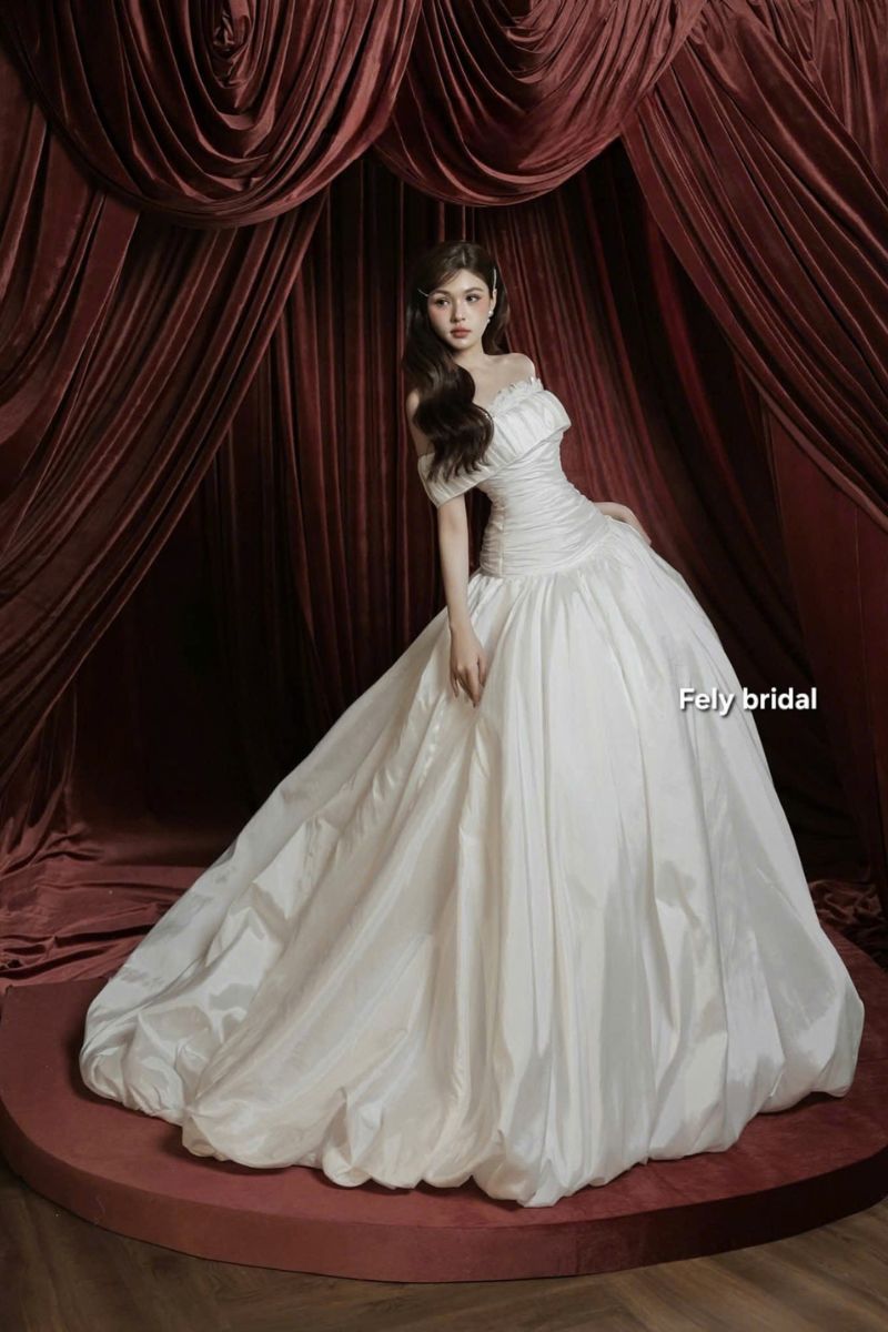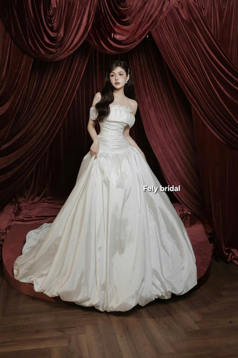 Ngày cưới luôn là khoảnh khắc đáng nhớ. Mọi chi tiết đều mang ý nghĩa riêng. Chiếc váy cưới vì thế cũng trở thành tâm điểm, không chỉ đẹp, nó còn thể hiện cá tính của cô dâu. Váy lụa trễ vai xếp ly tùng phồng cổ điển tại Fely Bridal được tạo nên từ tinh thần đơn giản nhưng tinh tế. Thiết kế mang vẻ đẹp cổ điển nhưng vẫn rất hiện đại. Chiếc váy giúp cô dâu trở nên nổi bật theo cách dịu dàng. Không cần quá nhiều chi tiết.