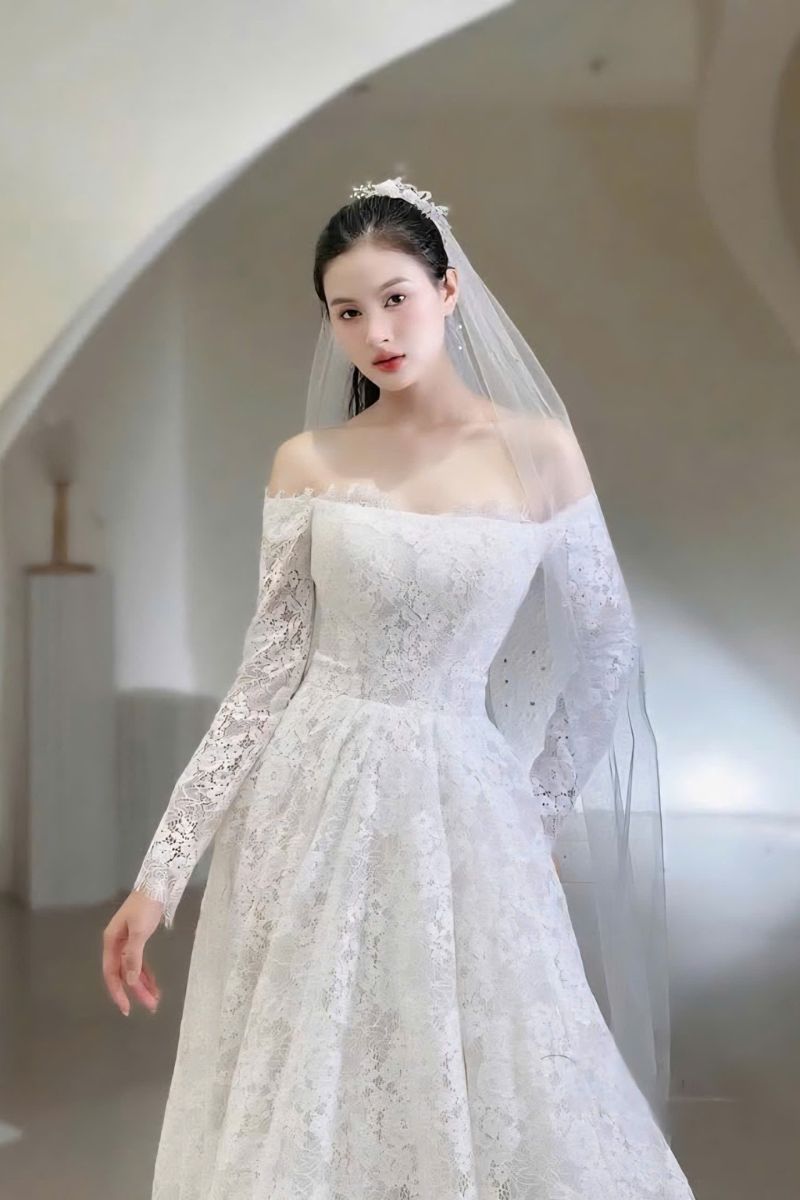 Nhiều cô dâu yêu vẻ đẹp nhẹ nhàng và cổ điển. Họ muốn chiếc váy cưới thanh lịch. Không quá cầu kỳ nhưng vẫn đủ tinh tế. Những thiết kế ren luôn mang lại cảm xúc đặc biệt. Chúng gợi sự lãng mạn và dịu dàng. Váy ren hoa trắng cổ ngang tay dài là thiết kế mang tinh thần như vậy. Chiếc váy toát lên vẻ đẹp rất thanh tao. Từng họa tiết ren mềm mại phủ khắp thân váy. Tổng thể tạo cảm giác tinh khôi và trang nhã. Khi cô dâu khoác lên chiếc váy này, vẻ đẹp trở nên nhẹ nhàng hơn. Không quá rực rỡ nhưng vẫn đủ thu hút. Đó chính là vẻ đẹp của sự tinh tế.