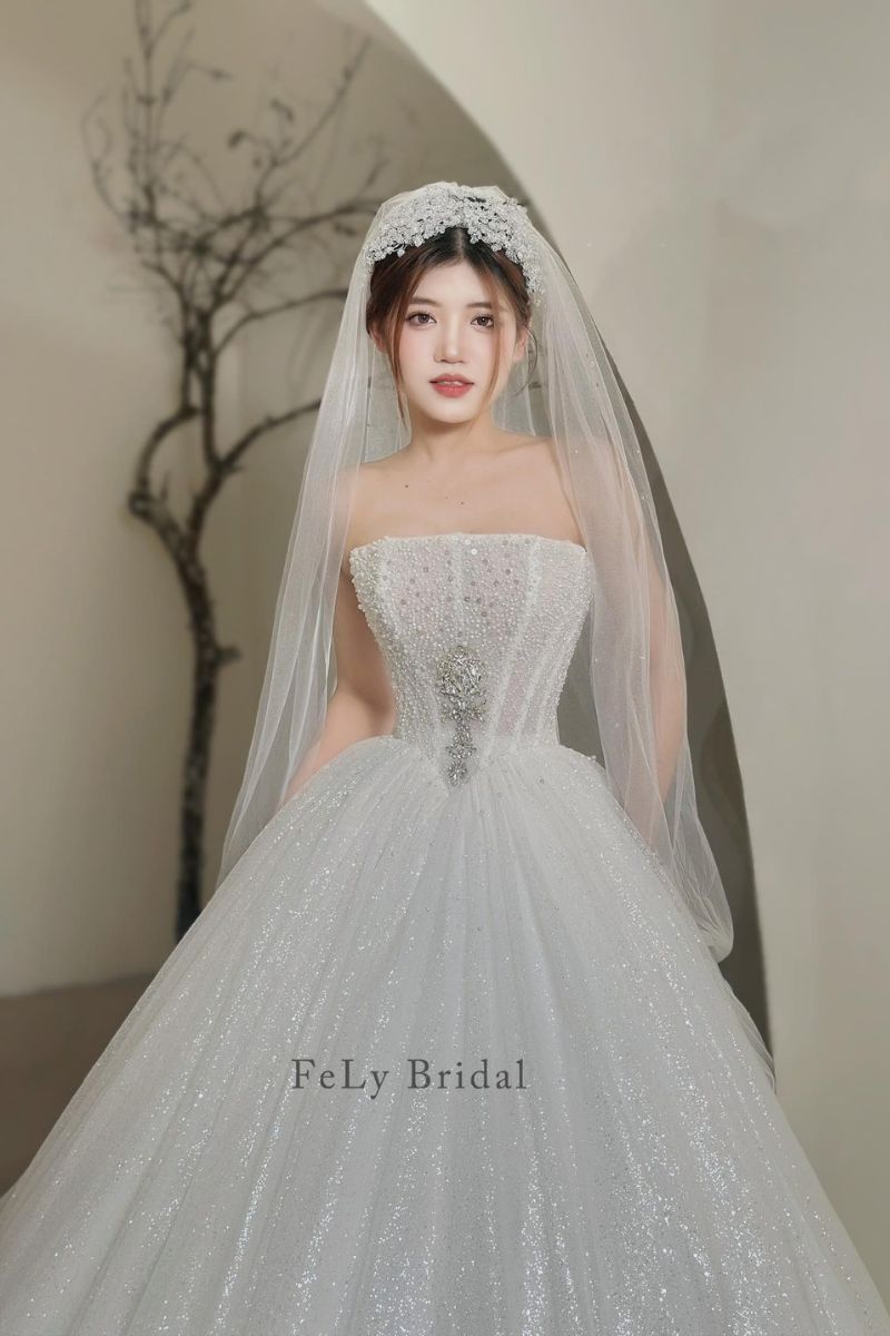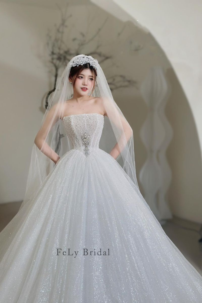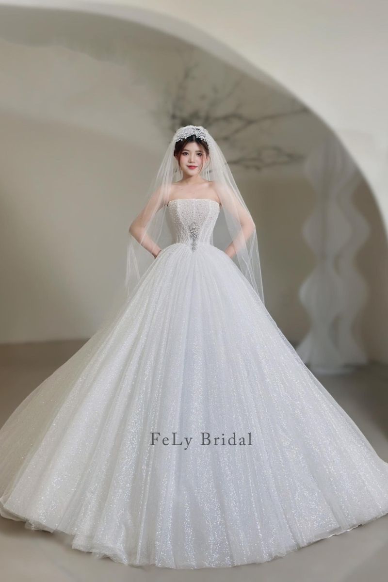 Tại Fely Bridal, mỗi chiếc váy đều được chỉnh sửa theo số đo riêng. Váy vừa vặn ngay từ lần thử đầu. Đội ngũ tư vấn luôn lắng nghe mong muốn của cô dâu. Mỗi lựa chọn đều dựa trên cảm xúc thật. Fely Bridal tin rằng váy cưới không chỉ là trang phục, váy là ký ức, là cảm xúc được lưu giữ. Váy công chúa tulle ánh sao corset ngực quây là một thiết kế như thế.